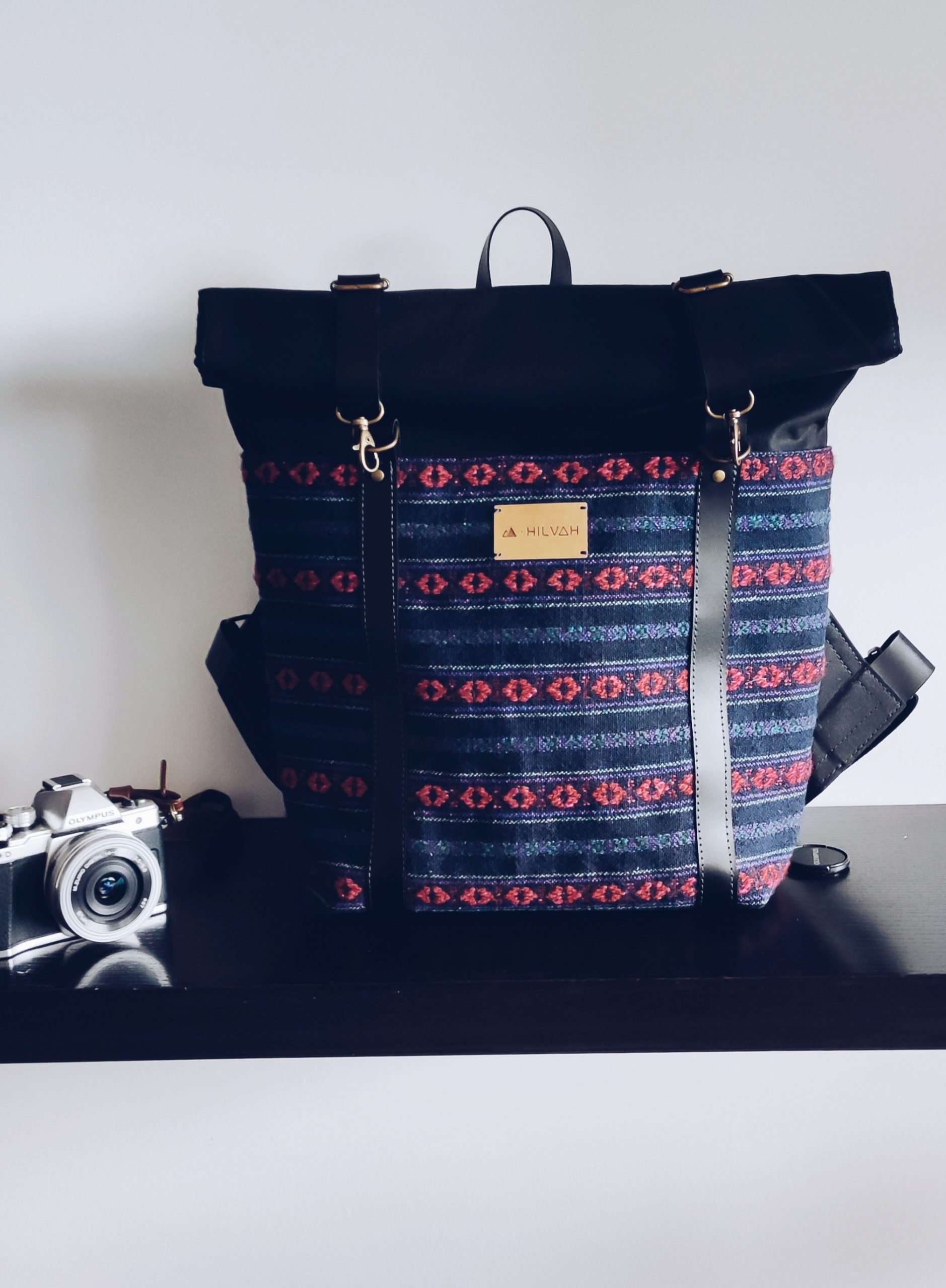 Nómada está cosida con lona encerada de color negro y tela de algodón tejida de patrón étnico.